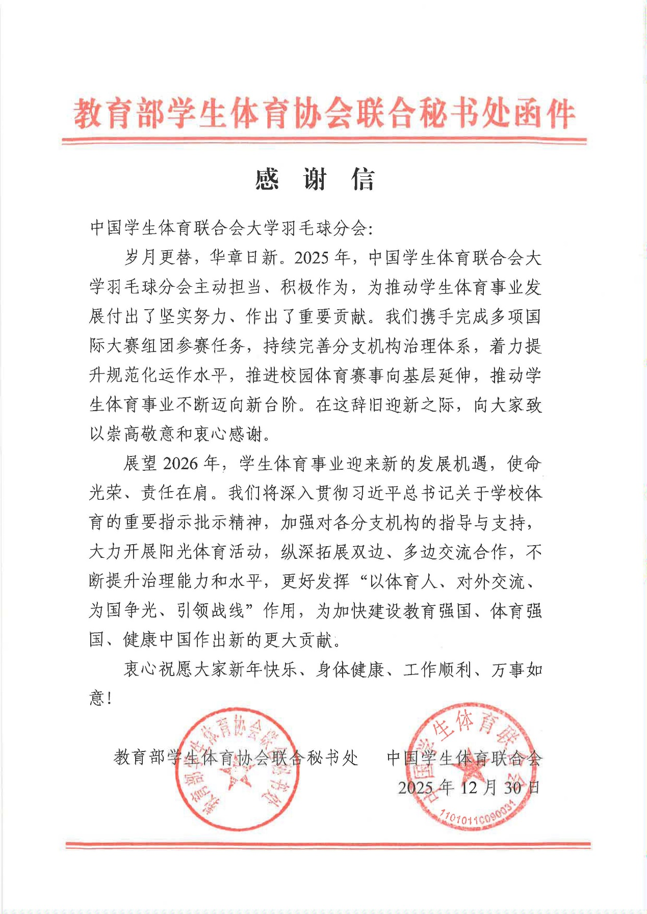在担任中国学生体育联合会大学羽毛球分会主席单位期间的优异表现表示敬意与赞赏。感谢信强调,吉林大学积极参与、主动担当,为推动学生体育事业的发展做出了重要贡献。
