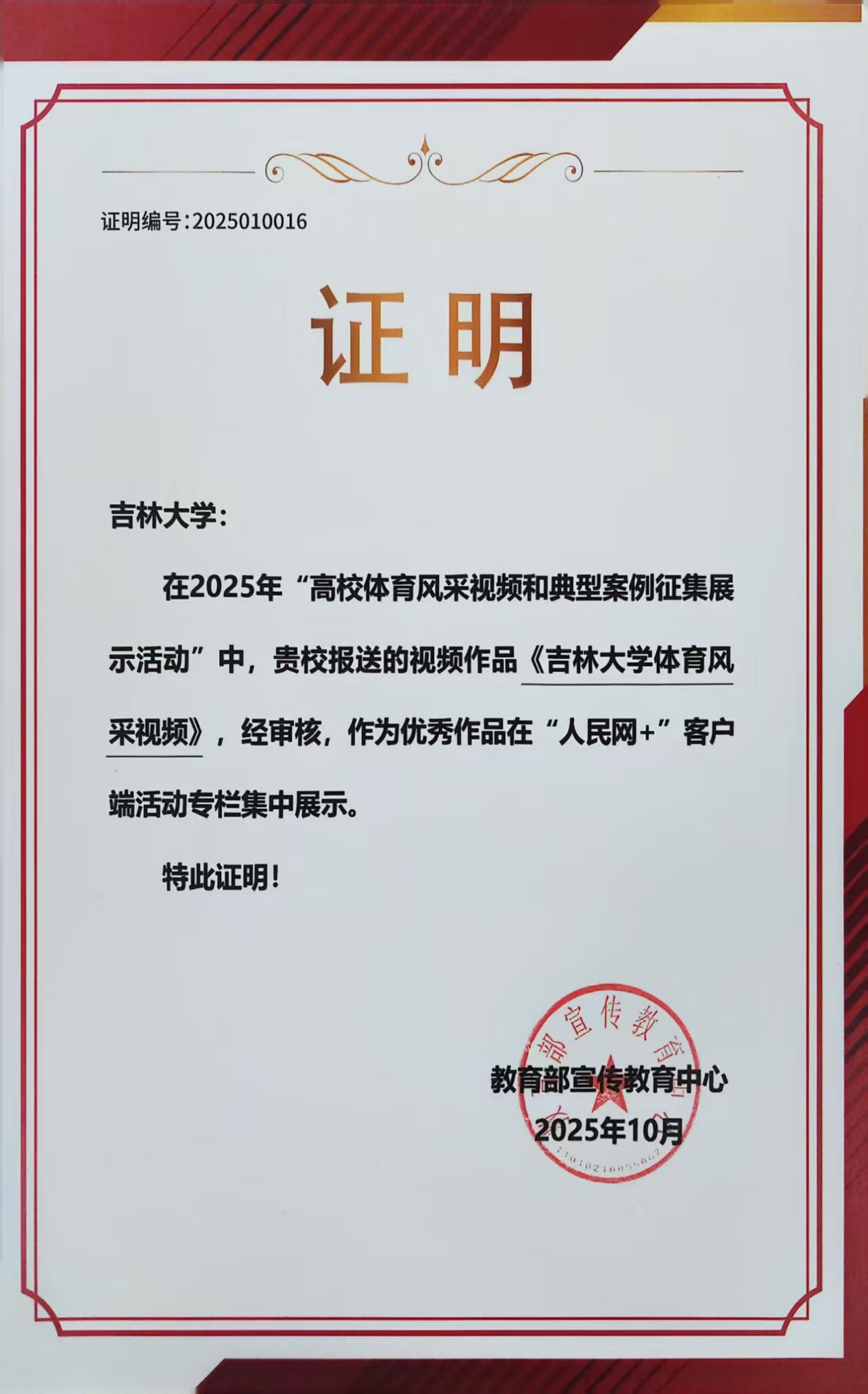 吉林大学积极参与此次活动,报送的视频作品经过严格审核,展示了学校在体育赛事、特色体育传承及体育文化建设方面的突出表现。这份荣誉不仅体现了吉林大学在推动校园体育发展和提升学生综合素质方面的努力与成就,更彰显了学校在体育育人、文化传承方面的独特优势和示范作用。